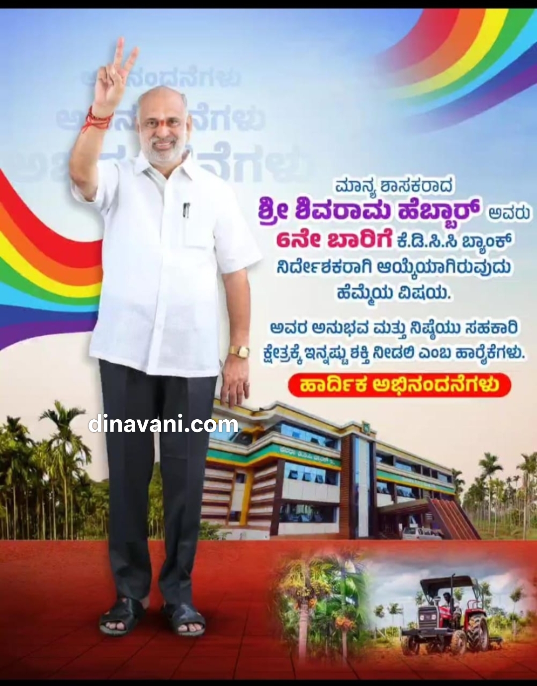 ಯಲ್ಲಾಪುರ ವಿಧಾನಸಭಾ ಕ್ಷೇತ್ರದ ಜನಸೇವೆಯ ಪರ್ಯಾಯವಾಗಿ ಹೆಸರು ಪಡೆದ ಮಾನ್ಯ ಶಾಸಕರಾದ ಶ್ರೀ ಶಿವರಾಮ ಹೆಬ್ಬಾರ್ ಅವರು, ಮತ್ತೆ ತಮ್ಮ ನಿಷ್ಠೆ ಮತ್ತು ಸಾಮರ್ಥ್ಯದಿಂದ ಹೊಸ ಮೆಟ್ಟಿಲೇರಿದ್ದಾರೆ. 6ನೇ ಬಾರಿಗೆ   (ಕೆ.ಡಿ.ಸಿ.ಸಿ) ಬ್ಯಾಂಕ್‌ನ ನಿರ್ದೇಶಕರಾಗಿ ಆಯ್ಕೆಯಾಗಿರುವುದು ಸಹಕಾರಿ ಚಳವಳಿಯಲ್ಲೊಂದು ಹೆಮ್ಮೆಯ ಕ್ಷಣವಾಗಿದೆ.