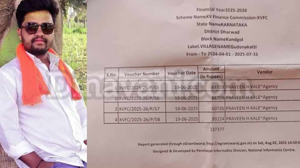 ಕುಂದಗೋಳ : ಗ್ರಾಮ ಪಂಚಾಯಿತಿ ವ್ಯಾಪ್ತಿಯ ಕಾಮಗಾರಿಗಳನ್ನು ಗ್ರಾಮ ಪಂಚಾಯಿತಿ ಸದಸ್ಯರ ಮಗನೇ ಅನುಷ್ಠಾನ ಮಾಡಿ ತನ್ನ ಬ್ಯಾಂಕ್ ಖಾತೆಗೆ 3,37,377 ರೂಪಾಯಿ ಹಣ ಪಡೆದ ಬಗ್ಗೆ ದಿನವಾಣಿ”ಗೆ ಮಾಹಿತಿ ಲಭ್ಯವಾಗಿದೆ.