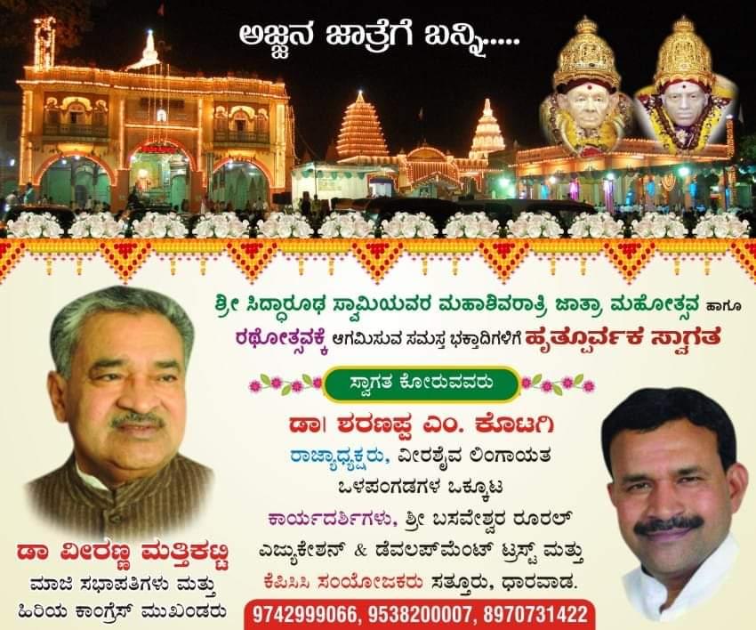 ನಗರದ ಇತಿಹಾಸ ಪ್ರಸಿದ್ಧ ಶ್ರೀ ಸಿದ್ದಾರೂಢ ಸ್ವಾಮಿಯವರ ಮಹಾಶಿವರಾತ್ರಿ ಜಾತ್ರಾ ಮಹೋತ್ಸವ ಹಾಗೂ ರಥೋತ್ಸವ ಹಿನ್ನೆಲೆಯಲ್ಲಿ ಶ್ರೀಮಠಕ್ಕೆ ಆಗಮಿಸುವ ಲಕ್ಷ ಲಕ್ಷ ಭಕ್ತ ಸಮೂಹವನ್ನು ಅವರು ಹೃತ್ಪೂರ್ವಕವಾಗಿ ಸ್ವಾಗತಿಸಿದ್ದಾರೆ.